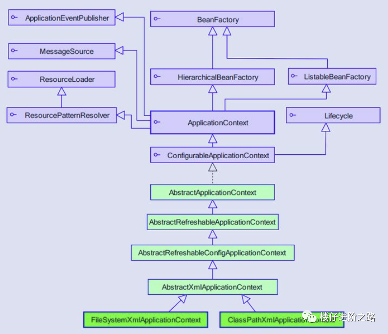 BeanFactory作为一个主接口不继承任何接口,暂且称为一级接口。 有3个子接口继承了它,进行功能上的增强。这3个子接口称为二级接口。 ConfigurableBeanFactory可以被称为三级接口,对二级接口HierarchicalBeanFactory进行了再次增强,它还继承了另一个外来的接口SingletonBeanRegistry ConfigurableListableBeanFactory是一个更强大的接口,继承了上述的所有接口,无所不包,称为四级接口。 (这4级接口是BeanFactory的基本接口体系。继续,下面是继承关系的2个抽象类和2个实现类:) AbstractBeanFactory作为一个抽象类,实现了三级接口ConfigurableBeanFactory大部分功能。 AbstractAutowireCapableBeanFactory同样是抽象类,继承自AbstractBeanFactory,并额外实现了二级接口AutowireCapableBeanFactory DefaultListableBeanFactory继承自AbstractAutowireCapableBeanFactory,实现了最强大的四级接口ConfigurableListableBeanFactory,并实现了一个外来接口BeanDefinitionRegistry,它并非抽象类。 最后是最强大的XmlBeanFactory,继承自DefaultListableBeanFactory,重写了一些功能,使自己更强大。