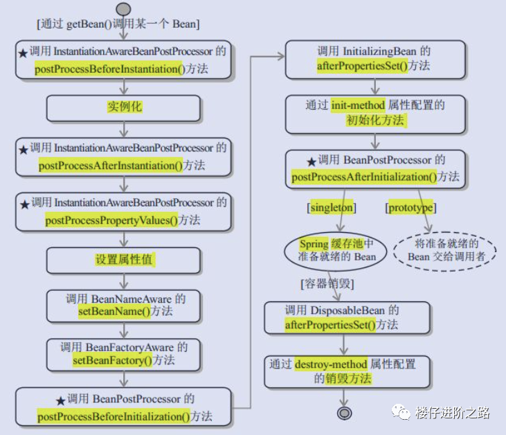Bean 自身的方法:如调用 Bean 构造函数实例化 Bean,调用 Setter 设置 Bean 的属性值以及通过 的 init-method 和 destroy-method 所指定的方法; Bean 级生命周期接口方法:如 BeanNameAware、 BeanFactoryAware、 InitializingBean 和 DisposableBean,这些接口方法由 Bean 类直接实现; 容器级生命周期接口方法:在上图中带“★” 的步骤是由 InstantiationAwareBean PostProcessor 和 BeanPostProcessor 这两个接口实现,一般称它们的实现类为“ 后处理器” 。后处理器接口一般不由 Bean 本身实现,它们独立于 Bean,实现类以容器附加装置的形式注册到 Spring 容器中并通过接口反射为 Spring 容器预先识别。当Spring 容器创建任何 Bean 的时候,这些后处理器都会发生作用,所以这些后处理器的影响是全局性的。当然,用户可以通过合理地编写后处理器,让其仅对感兴趣Bean 进行加工处理