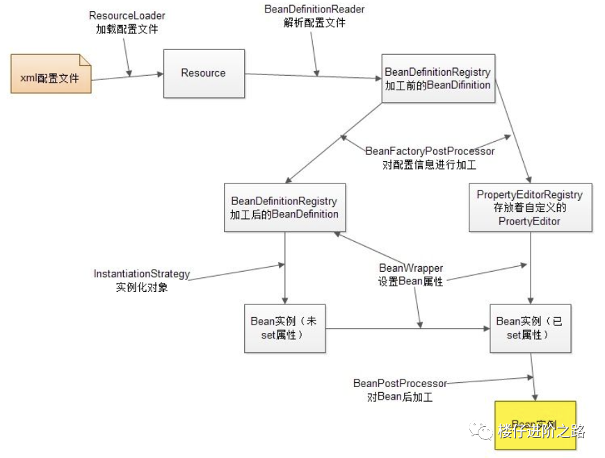 该图描述了Spring容器从加载配置文件到创建出一个完整Bean的作业流程: