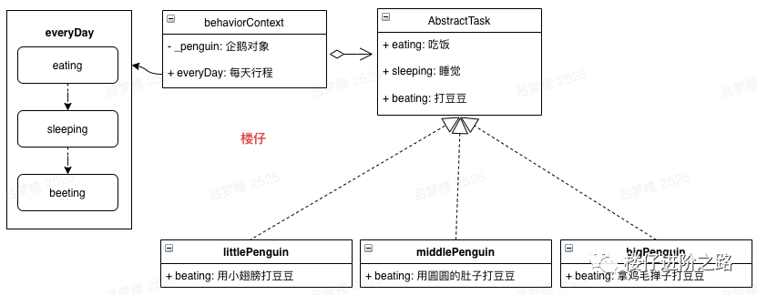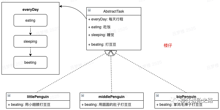 这3只企鹅,由于每天吃的都一样,睡觉也都是站着睡,但是打豆豆的方式却不同,所以我们可以将“吃饭,睡觉,打豆豆”抽象出来,因为“吃饭,睡觉”都一样,所以我们可以直接实现出来,但是他们“打豆豆”的方式不同,所以封装成抽象方法,需要每个企鹅单独去实现“打豆豆”的方式。最后再新增一个方法everyDay(),固定每天的执行流程: