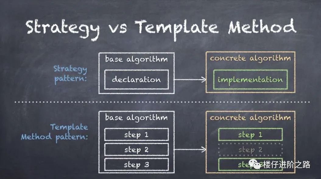 在Strategy模式中,类的整体行为一般用接口表示,另一方面,Template方法用于减less代码重复,样板代码在基本框架或抽象类中定义。在Template Method中,甚至可以有一个具有默认实现的具体类。