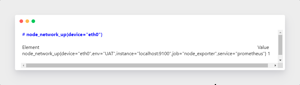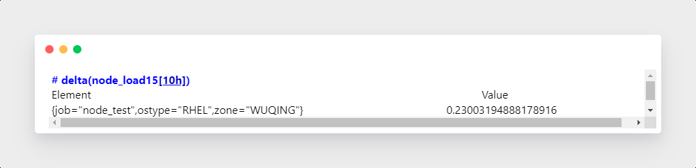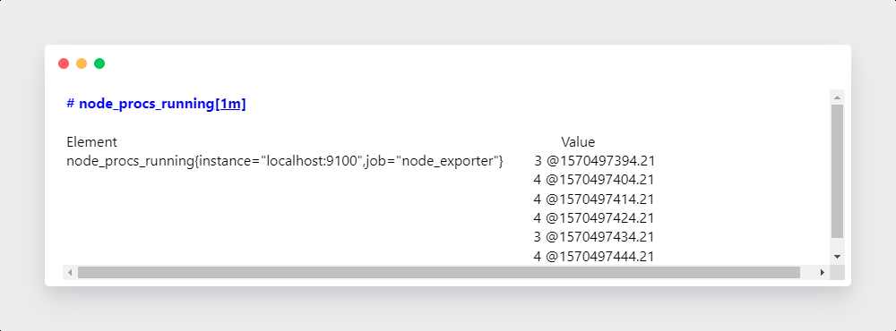 瞬时向量选择器可以对一组时间序列数据进行筛选,并给出结果中的每个结果键值对(时间戳-样本值): 最简单的形式是,只有一个度量名称被指定。在一个瞬时向量中这个结果包含有这个度量指标名称的所有样本数据键值对。