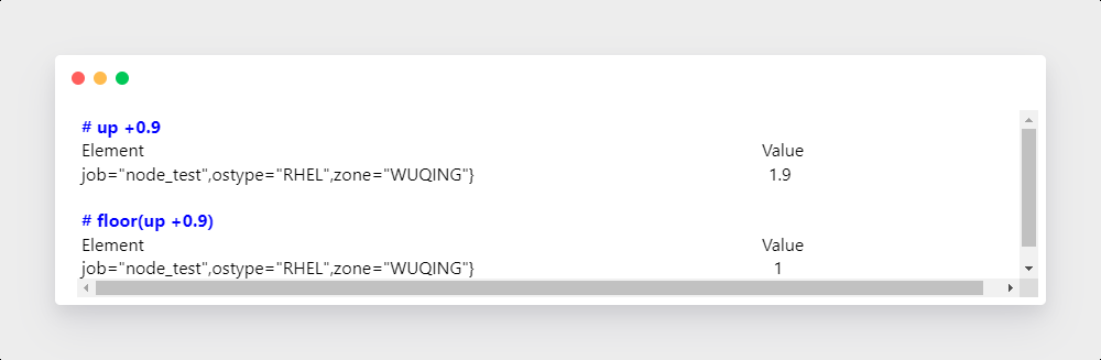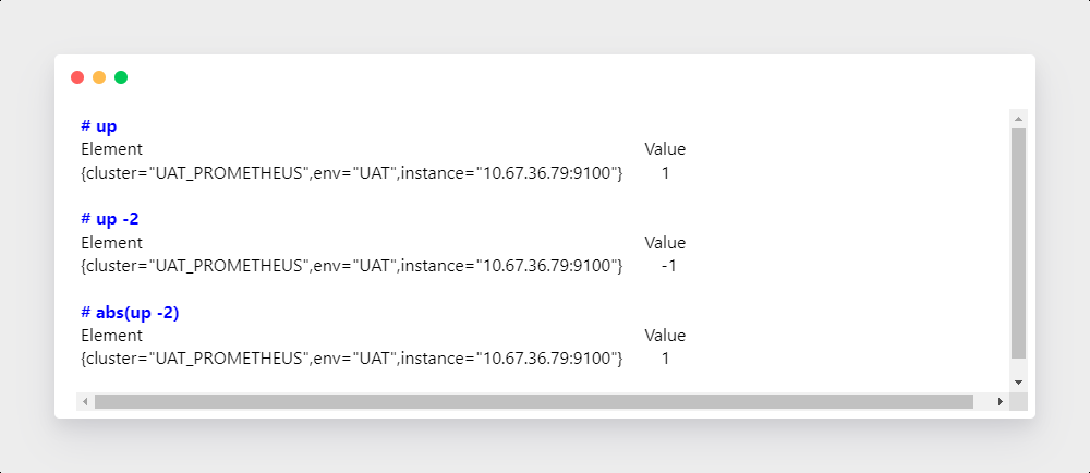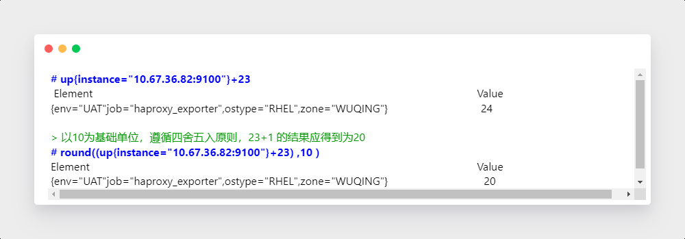 瞬时向量和标量之间的比较运算,这个操作符会应用到某个当前时刻的每个时间序列数据上,如果一个时间序列数据值与这个标量比较结果是false