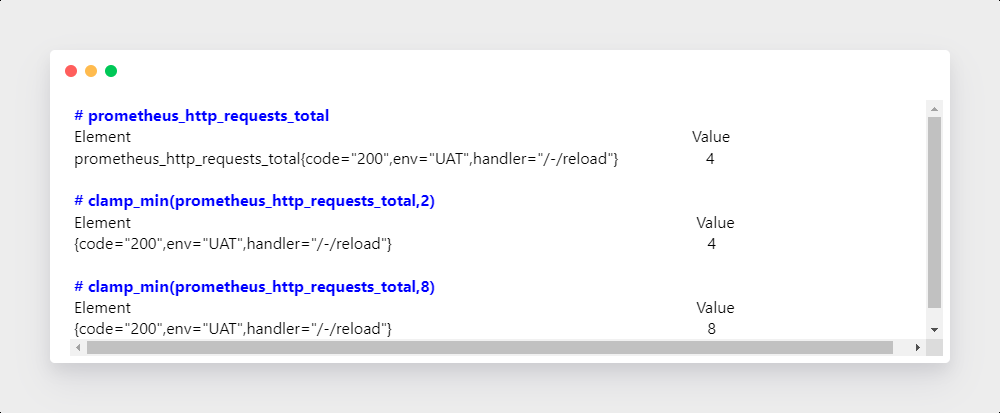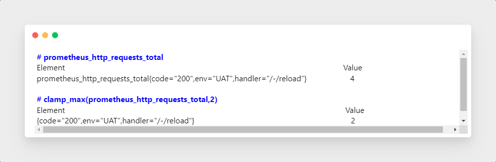 : 区间向量内每个度量指标的最小值。max_over_time(range-vector)