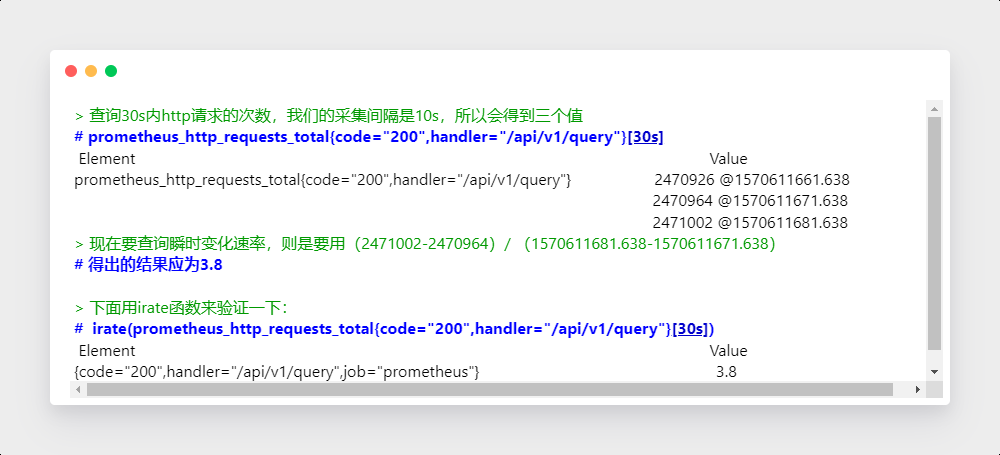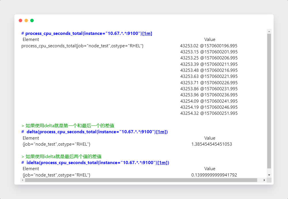 瞬时向量 - 它是指在同一时刻,抓取的所有度量指标数据。这些度量指标数据的key都是相同的,也即相同的时间戳。range vector