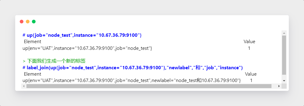 例如,以下表达式返回的时间序列多了一个 newlabel 标签,标签值为 :"node_test和10.67.36.79:9100"