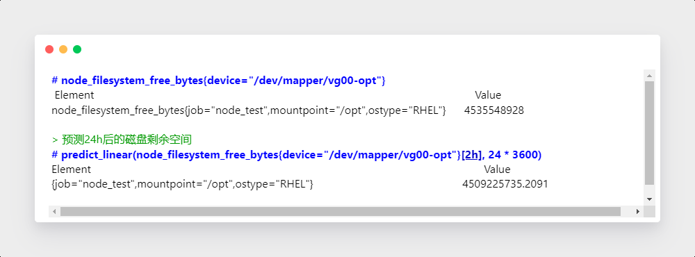 例如,基于 2 小时的样本数据,来预测主机可用磁盘空间的是否在 24 个小时候被占满,可以使用如下表达式: