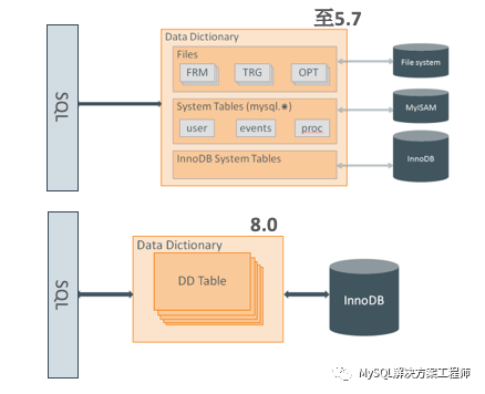 8.0之前的MySQL,服务器和Inndb的数据字典会分别保存在不同的地方,里面会有一些重复的数据,这些数据可能好长一段时间不会进行同步。另外对于类似MyISAM表的FRM, .PAR, .OPT, .TRN等不同文件进行管理时,需要使用复杂的代码控制主从复制、崩溃故障恢复状态。并且缺乏可扩展性。现在将这些元数据文件存储在数据字典表中。