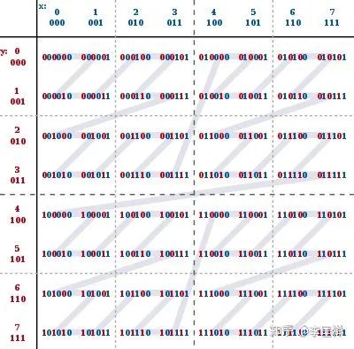 参考wikipedia中的Z-Order介绍,可以通过对两个数据比特位的交错填充来构建z-value,如下图所示,对于(x, y)两维数据,数据值 0 ≤ x ≤ 7, 0 ≤ y ≤ 7,构建的z-values以及z-order顺序如下: