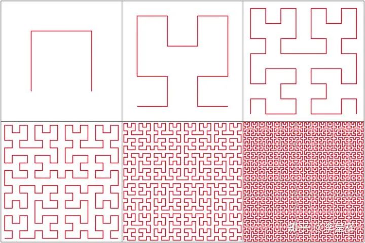 Interleaved Order可以按照多个字段分布聚集,但是Z-ORDER曲线也有一个比较小的缺点,就是Z字形之间的连接可能跨度会比较长,在Spark的实现中我们基于Ranger Partitioner切分不同分区数据,切分的Boundary没法准确切中完整的Z字形区域数据,所以IceBerg文件中的Min/Max可能会出现较大的重合,降低Data Skipping的效率。Hibert Curve是另外一种可以用一条无限长的线,穿过任意维度空间里面的所有点的曲线类型[5],并且相对于Z-ORDER曲线,Hibert曲线在其将多维空间转换为一维空间的方法更好地保留了空间邻近性。一到六阶Hibert曲线的示例如下: