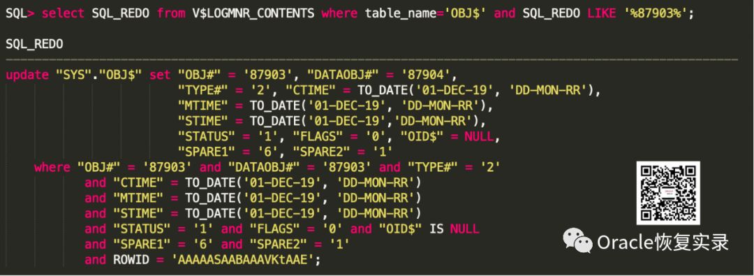 需要提醒的是:由于表可能会被truncate过多次,原dataobj#不一定就等于obj#,所以需要通过redo来确认。如果最小补充日志没有打开,logminer可能会有遗漏,如果遗漏则需要使用redodump来寻找。