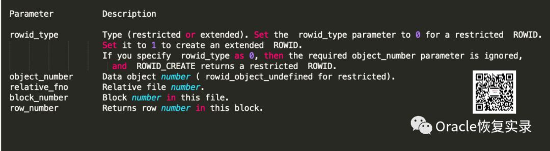 dbms_rowid.rowid_create 参数解释如下: