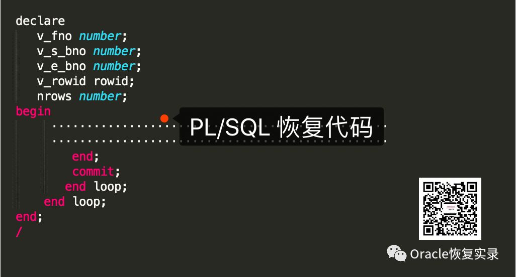 我们首次公开分享该PL/SQL代码,请扫码图片上面二维码关注我们的公众号,并在后台回复关键词:“plsql恢复代码”,你便可以得到PL/SQL恢复代码的全部内容!