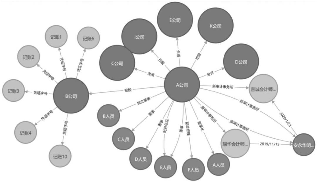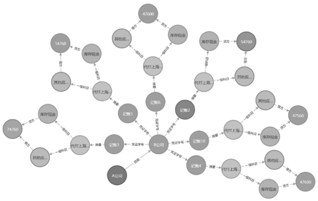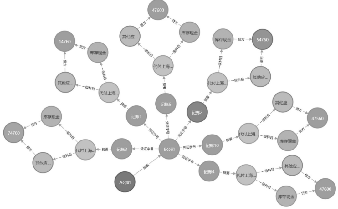 Neo4j是目前所有图形数据库中使用比例最高的图数据库。在审计数据知识图谱的维护方面,Neo4j图数据库同样具备传统数据库所拥有的增、删、改功能。若审计工作者需要在Neo4j中创建新的审计实体节点、审计实体节点的类型或者在已经存在的审计实体节点之间建立新的关联,审计工作者都可以通过Cypher语句进行相应编写与操作。同时,审计工作者还可以直接在审计数据知识图谱中直接打开或者关闭相关审计实体节点的视角,调整审计数据知识图谱的整体结构,以满足当前审计数据的可视化需求。知识图谱的形式所展示的查找审计数据的方式区别于传统的搜索引擎,不仅兼顾审计数据的高访问性与抽象数据的可视化功能,而且提供审计工作者挖掘审计实体之间潜在关联的手段,能够大幅提升审计工作者决策的相关性。