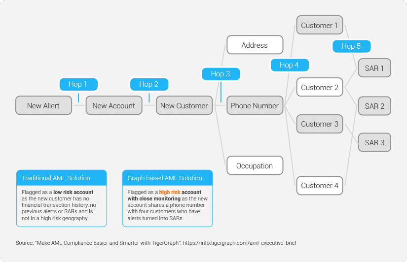 新客户与其他四个拥有多个 SAR 的现有客户共享一个电话号码,因此被指定为高风险。使用人工审查或现有模型和系统很难通过电话号码发现这种隐藏或未声明的关系。