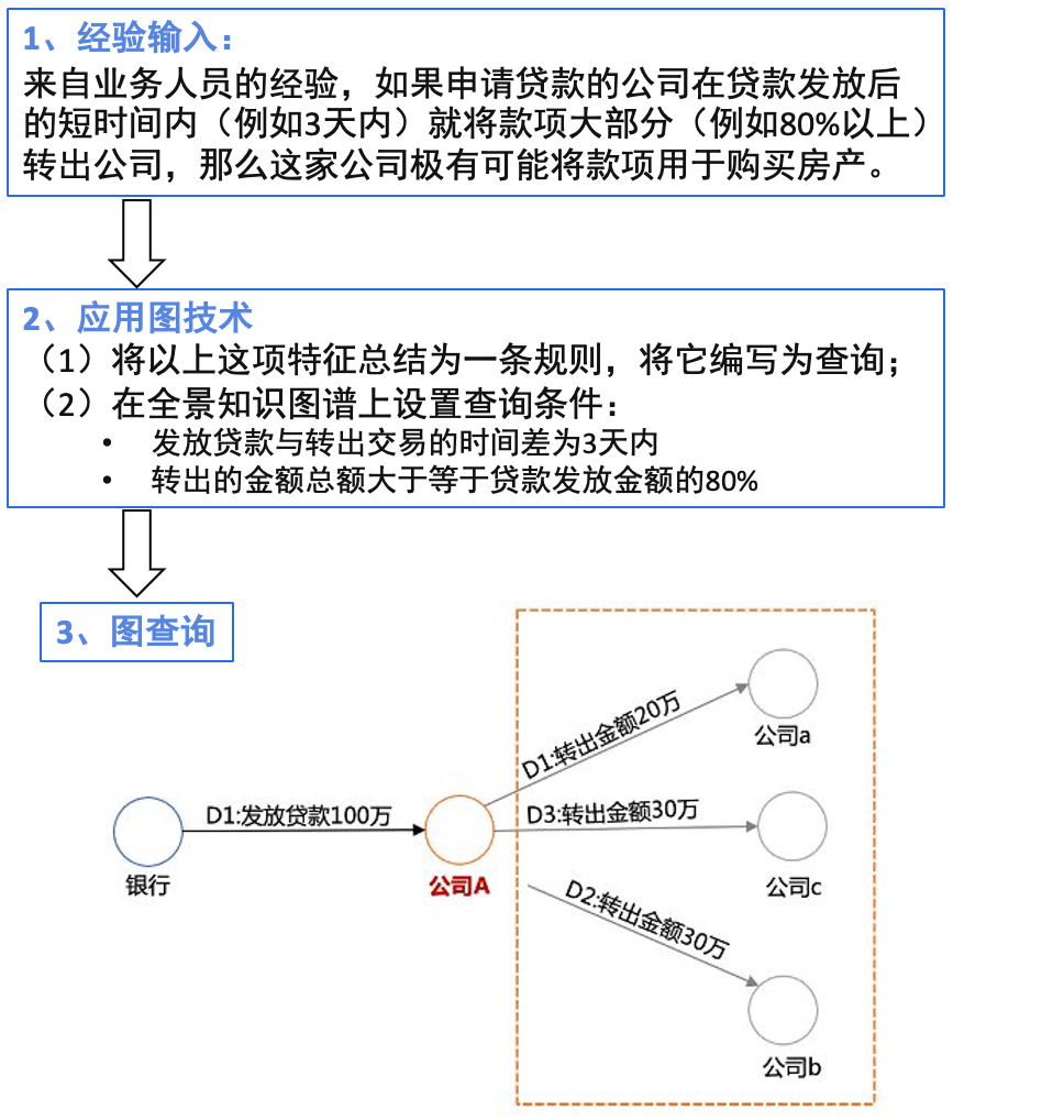 并且通过构建图,我们发现公司A转出的金额和公司B收入的金额接近,有助于业务人员对两公司之间的交易行为进行进一步甄别和判断,而这在传统的关系型数据库中是很难直接看出的。所以更近一步地,我们可以设计出如下这样的方案,帮助揪出违规资金用途: