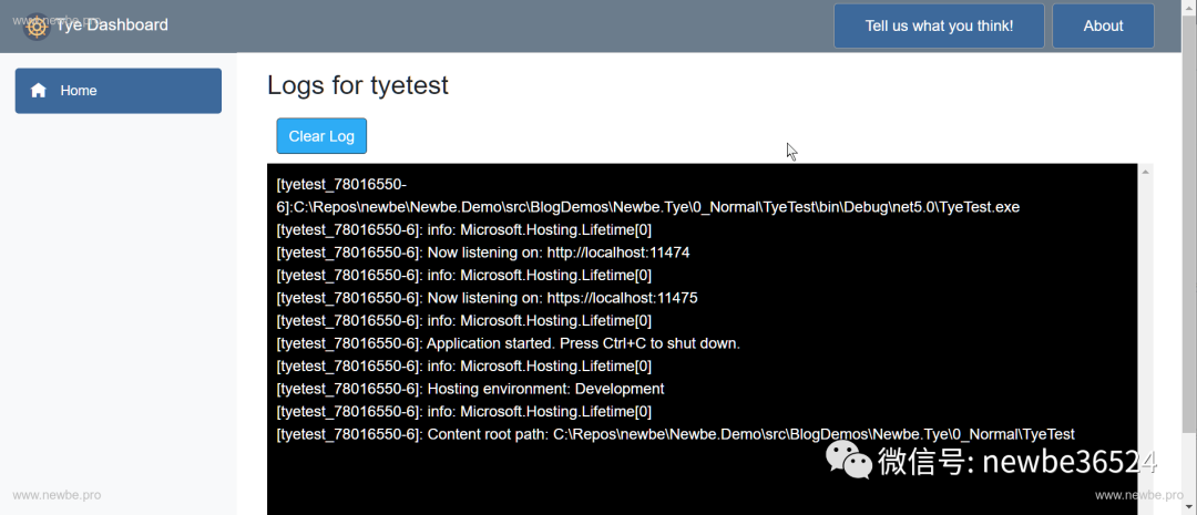 命令启动应用,我们其实可以在 tye dashboard 中查看到查看到以控制台方式输出的日志: