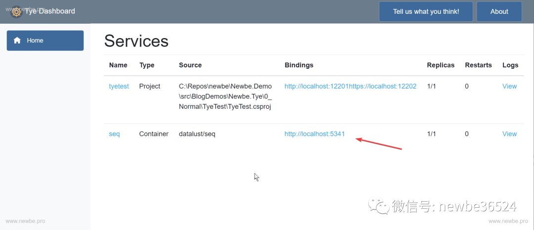 故此,我们只要本地部署一个 seq 服务,然后在tye.yml