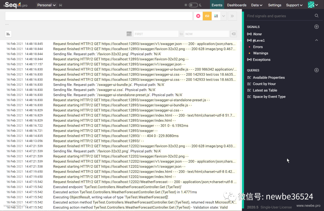 使用浏览器调用一下 swagger 界面中的 API。便可以在 seq 中查看到最新的日志。