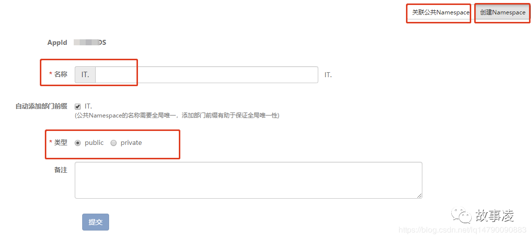 ,填写名称并选择类型,填好备注点击提交即可完成创建,属性添加同默认Namespace一致。