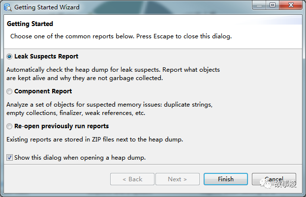 Eclipse Memory Analyzer(MAT)支持两种安装方式,一是Eclipse插件的方式,另外一个就是独立运行的方式,建议使用独立运行的方式。在 http://www.eclipse.org/mat/downloads.php 下载安装MAT,启动之后打开 File - Open Heap Dump... 菜单,然后选择生成的Heap DUmp文件,选择 "Leak Suspects Report",然后点击 "Finish" 按钮。
