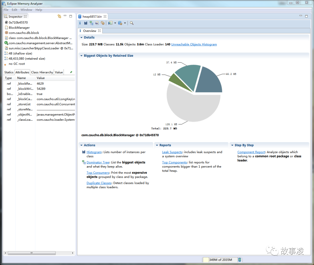 Biggest Objects by Retained Size 使用饼图的方式直观地显示了在JVM堆内存中最大的几个对象,当光标移到饼图上的时候会在左边Inspector和Attributes窗口中显示详细的信息。