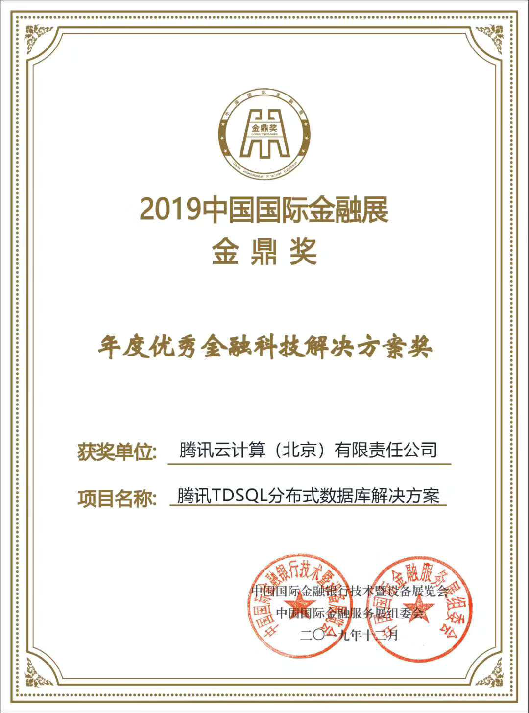 1月13日消息,2019中国国际金融展“金鼎奖”评选结果日前揭晓,腾讯云TDSQL凭借创新的技术突破与在金融核心场景下的成功应用实践,荣获“金鼎奖——年度优秀金融科技解决方案奖”。