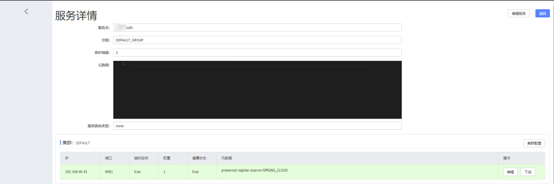 进入 服务详情,可对服务的元数据,服务下线、上线进行编辑控制,如图