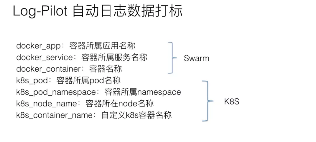 支持日志自动数据打标。log-pilot 在采集容器日志的时候,同时也会收集容器的元数据信息,包括容器的名称,容器所属的服务名称以及容器所属的应用名称,同时在 Kubernetes 里面也会采集容器所属的 Pod 信息,包括 Pod 的名称,Pod 所属的 namespace 以及 Pod 所在的节点信息。这样排查问题时,就可以很方便地知道这个日志是来源于哪个节点上的哪个应用容器。