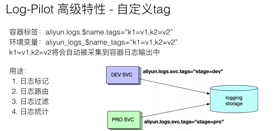 log-pilot 支持自定义Tag,我们可以在容器的标签或者环境变量里配置 aliyun.logs.$name.tags: k=v