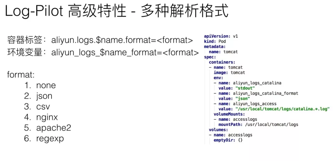 log-pilot 支持多种日志解析格式,通过 aliyun.logs.$name.format: <format>