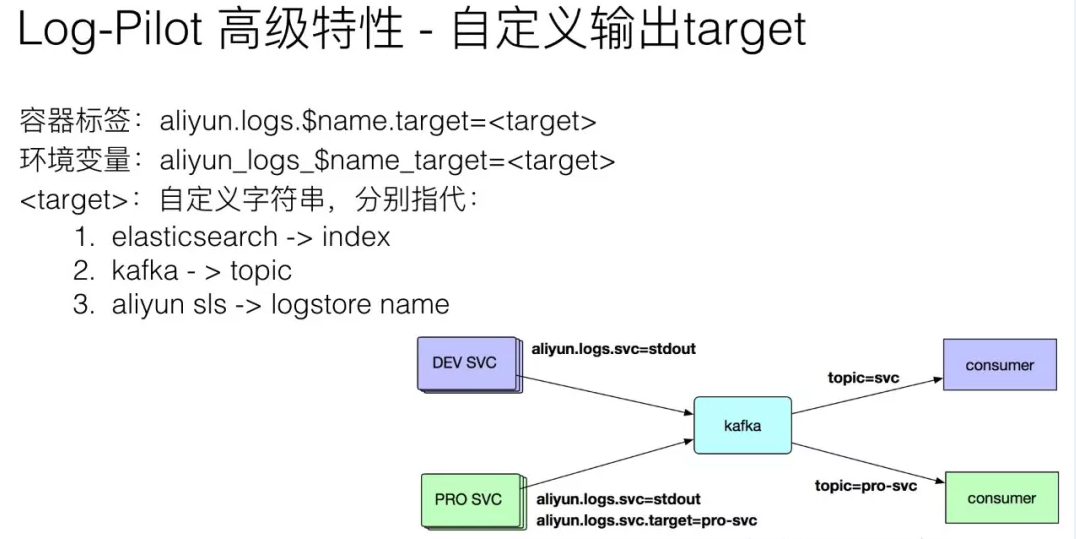 假设我们同时有一个生产环境和一个测试环境,应用日志都需要被采集到同一套 Kafka 中,然后由不同的 consumer 去消费。但是我们希望对环境进行区分,某条日志是由生产环境的应用容器产生的,还是测试环境的应用容器产生的,但我们在测试环境中的应用容器已经配置了 aliyun.logs.svc=stdout 标签,那么当这些应用容器的标准输出日志被采集到 kafka 中,它最终会被路由到 topic=svc 的消息队列中,那么订阅了 topic=svc 的 consumer 就能够接收测试环境的应用容器产生的日志。但当我们将该应用发布到生产环境时,希望它产生的日志只能交由生产环境的 consumer 来接收处理,那么我们就可以通过 target 的方式,给生产环境的应用容器额外定义一个 target=pro-svc,那么生产环境的应用日志在被采集到 Kafka 中时,最终会被路由到 topic 为 pro-svc 的消息队列中,那么订阅了 topic =pro-svc 的 consumer 就可以正常地接收到来自于生产环境的容器产生的日志。