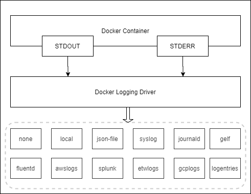当我们启动一个容器时,其实是作为Docker Daemon的一个子进程运行,Docker Daemon可以拿到容器里进程的标准输出与标准错误输出,然后通过Docker的Log Driver模块来处理。如下图所示