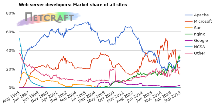 在nginx以前,比较流行的HTTP服务器应属Apache(LAMP中的A就是指的Apache)。但根据netcraft的调查显示,近两年nginx已经超越Apache,成为市场占有率第一的HTTP服务器。如下图