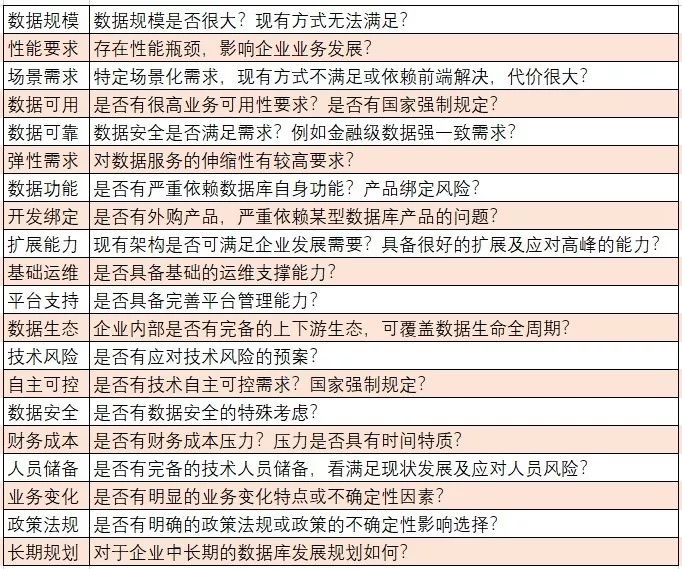 前面谈了很多,那么企业究竟该如何选择呢?本文不会给你答案,但简单罗列了些问题。希望企业可以在选择之前,对自身做个问卷调查,做好理性分析并指导自己的决定。下面以数据库为例,给出若干示例问题。