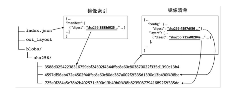 镜像规范中镜像的内容(如文件等)大多是通过摘要来标识和引用的。