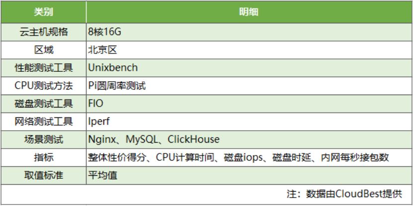 ①云主机性能共进行 3 次测试,其中所有的云主机均为新购主机,每完成一次测试空跑 8 小时以上再进行下一次测试,最终取 3 次测试的平均值。
