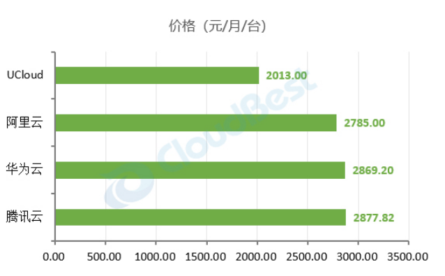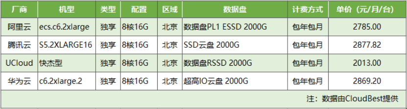 由上图我们可以看出,UCloud 在 8 核 16G 配置的云主机下,价格最低,这也与其突出的性价比表现相呼应;阿里云、华为云及腾讯云三家云厂商的云主机单价价格比较接近,但相对来说,阿里云对比华为云和腾讯云,价格略低一些。