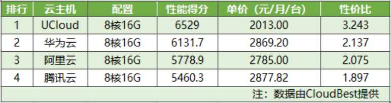 综合此次测试结果,四家云厂商在 8 核 16G 云主机配置下,在性价比排行上,UCloud 占据此次评测第一位。华为云、阿里云和腾讯云差距不大,依次位列第二、第三、第四位。