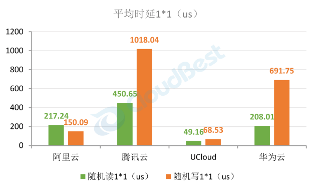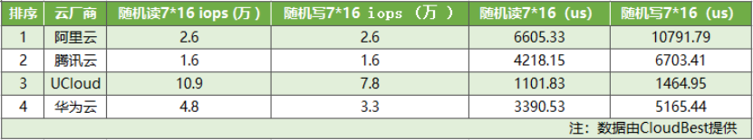 由队列深度分别为 1*1 和 7*16 的两组数据图表,我们可以看出,UCloud 在磁盘的随机读写测试中,表现都非常好,数据远超其他3家云厂商。
