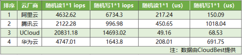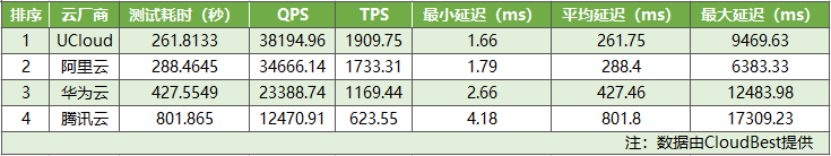 由上图我们可以看出,UCloud、华为云以及阿里云的云主机表现都很好,其中 UCloud 表现最佳。