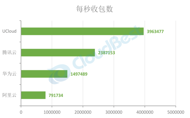在内网的质量测试上,四家厂商差距较大。UCloud 每秒接收到小包的数量为接近 400 万个,位列第一位。