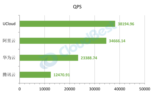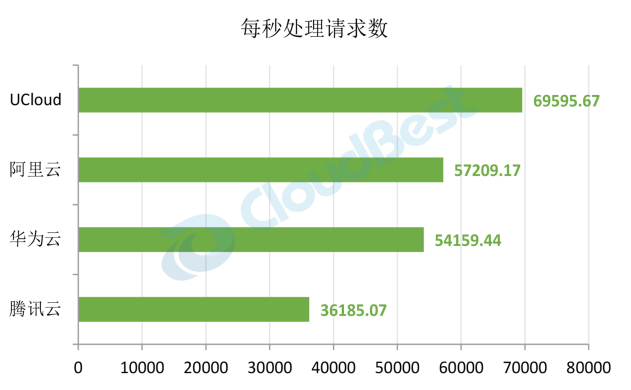 由上图我们可以看出,UCloud 和阿里云在每秒请求数和每秒事务数的指标上都表现不错,位居第一、第二位。而华为云和腾讯云在此项测试结果中,不占优势。