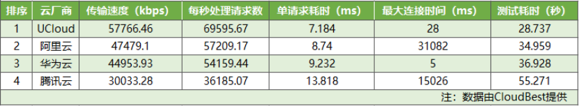由上图我们可以看出,UCloud 耗时最短,位居第一。腾讯云比 UCloud 耗时长,但是却优于华为云和阿里云,因此位居第二位。华为云和阿里云耗时相近,分别位居第三、第四位。