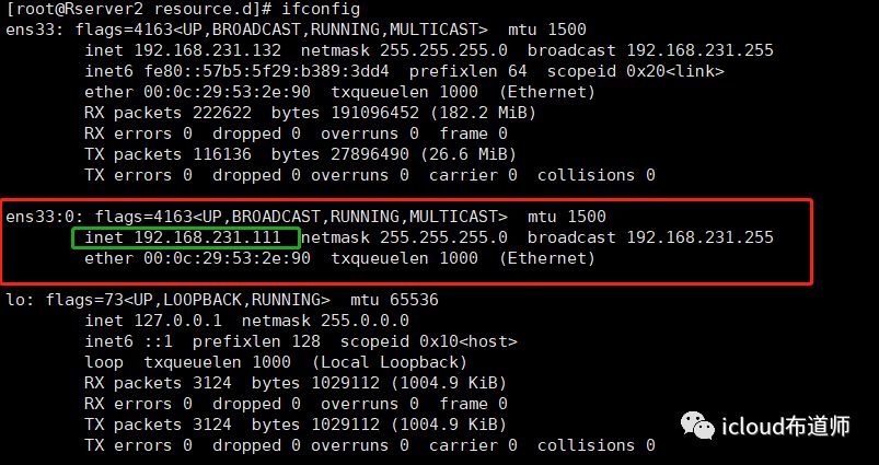 [root@Rserver1 resource.d]# ifconfigens33: flags=4163<UP,BROADCAST,RUNNING,MULTICAST> mtu 1500inet 192.168.231.130 netmask 255.255.255.0 broadcast 192.168.231.255inet6 fe80::19f4:46f4:5480:a6a8 prefixlen 64 scopeid 0x20<link>ether 00:0c:29:ef:39:a4 txqueuelen 1000 (Ethernet)RX packets 158177 bytes 204326501 (194.8 MiB)RX errors 0 dropped 0 overruns 0 frame 0TX packets 48457 bytes 22659488 (21.6 MiB)TX errors 0 dropped 0 overruns 0 carrier 0 collisions 0ens33:0: flags=4163<UP,BROADCAST,RUNNING,MULTICAST> mtu 1500inet 192.168.231.111 netmask 255.255.255.0 broadcast 192.168.231.255ether 00:0c:29:ef:39:a4 txqueuelen 1000 (Ethernet)