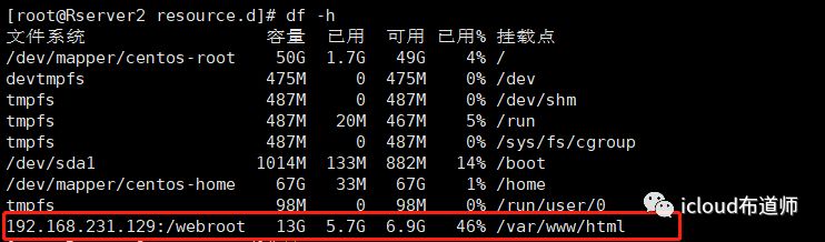 [root@Rserver1 resource.d]# df -h文件系统 容量 已用 可用 已用% 挂载点/dev/mapper/centos-root 8.0G 4.6G 3.5G 58% /devtmpfs 373M 0 373M 0% /devtmpfs 390M 0 390M 0% /dev/shmtmpfs 390M 18M 373M 5% /runtmpfs 390M 0 390M 0% /sys/fs/cgroup/dev/sda1 1014M 166M 849M 17% /boottmpfs 78M 4.0K 78M 1% /run/user/42tmpfs 78M 52K 78M 1% /run/user/1000/dev/sr0 4.3G 4.3G 0 100% /mediatmpfs 78M 0 78M 0% /run/user/0192.168.231.129:/webroot 13G 5.7G 6.9G 46% /var/www/html