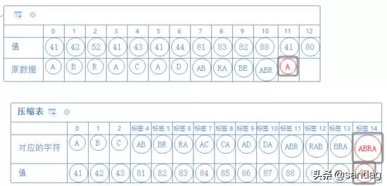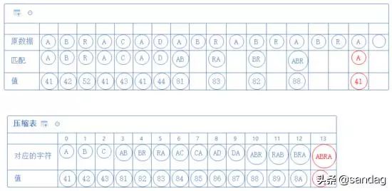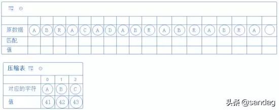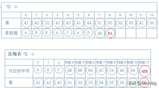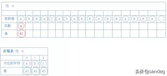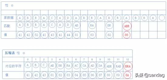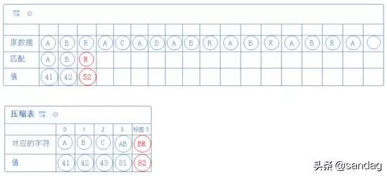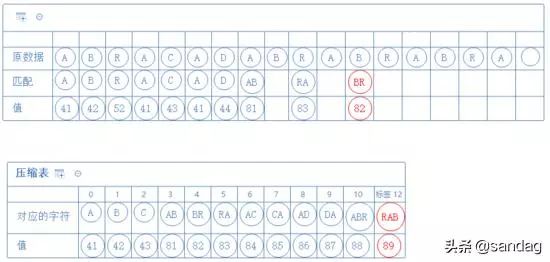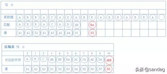 下一个字符为R, R在压缩表里已存在,但下下一个字符为A,它们两组合而成的RA也在压缩表里,我们取含字符最多的RA;