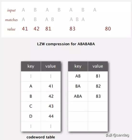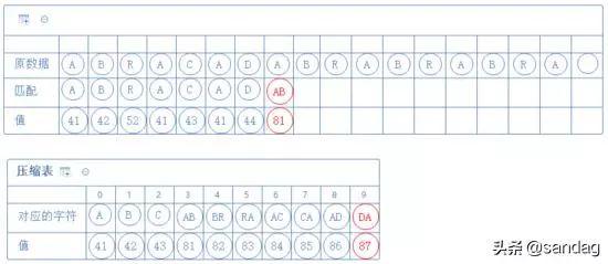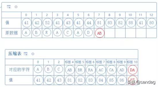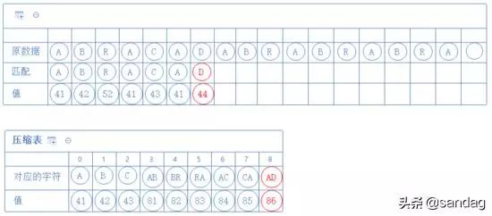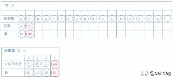 下一个字符为A, A在压缩表里已存在,但下下一个字符为B,它们两组合而成的AB也在压缩表里,我们取含字符最多的AB: