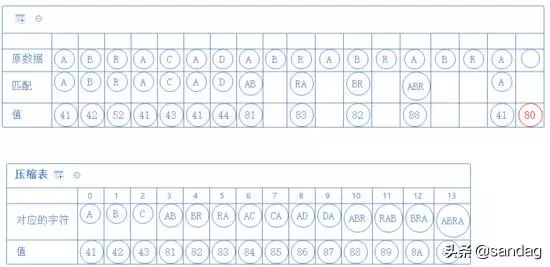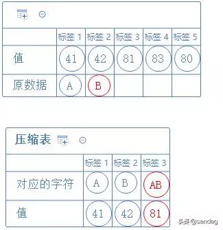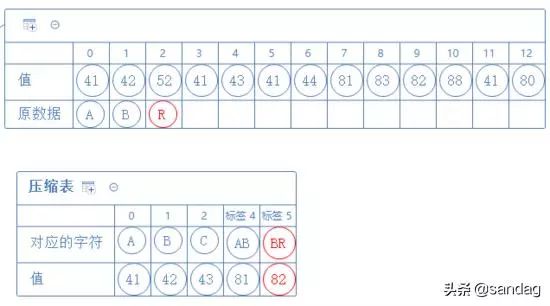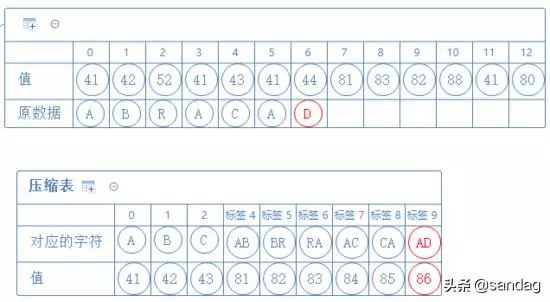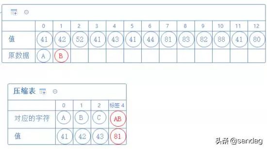前一个字符A与这个字符B结合成AB,给它一个值:81,加到压缩表中: