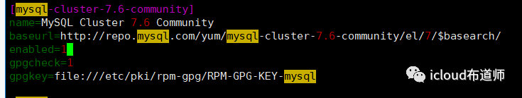 [mysql-cluster-7.6-community]name=MySQL Cluster 7.6 Communitybaseurl=http://repo.mysql.com/yum/mysql-cluster-7.6-community/el/7/$basearch/enabled=1gpgcheck=1gpgkey=file:///etc/pki/rpm-gpg/RPM-GPG-KEY-mysql